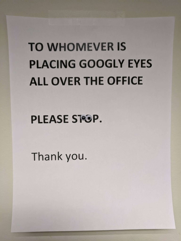 Who doesn’t love googly eyes? Just that part alone seems to be strange enough to make us question this scenario. Placing googly eyes around the office seems like a harmless enough prank to do to liven up office morale, so for management to have an issue with it makes us feel as though management is perhaps the actual issue.